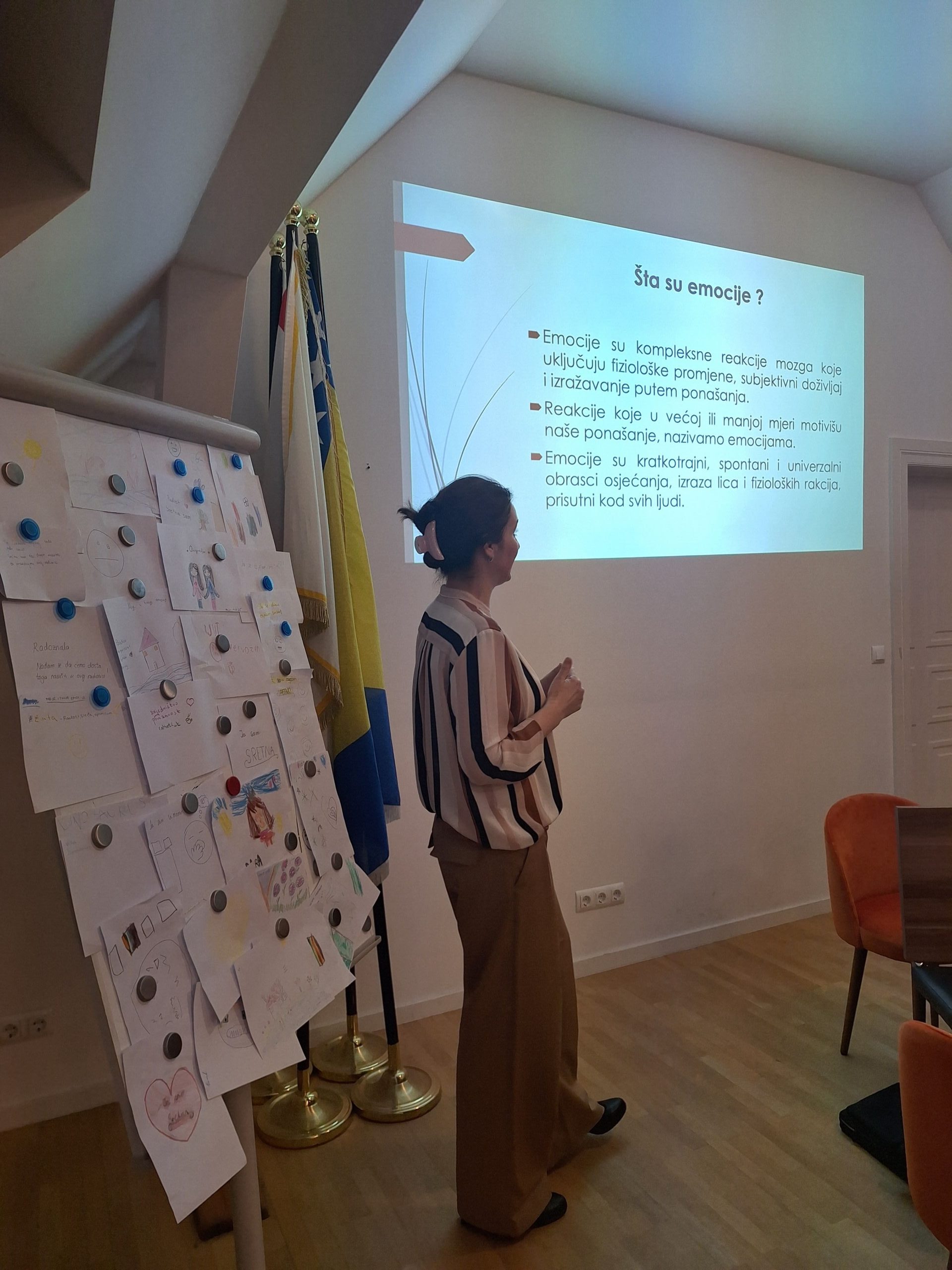 Radionica je započela temom „Kako se danas osjećam?“ tokom koje su djeca i roditelji kroz crtež imali priliku izraziti vlastita osjećanja. U nastavku je predstavljeno šest osnovnih emocija, koje su djeca na zanimljiv i njima blizak način prepoznavala i izražavala kroz igru i glumu.