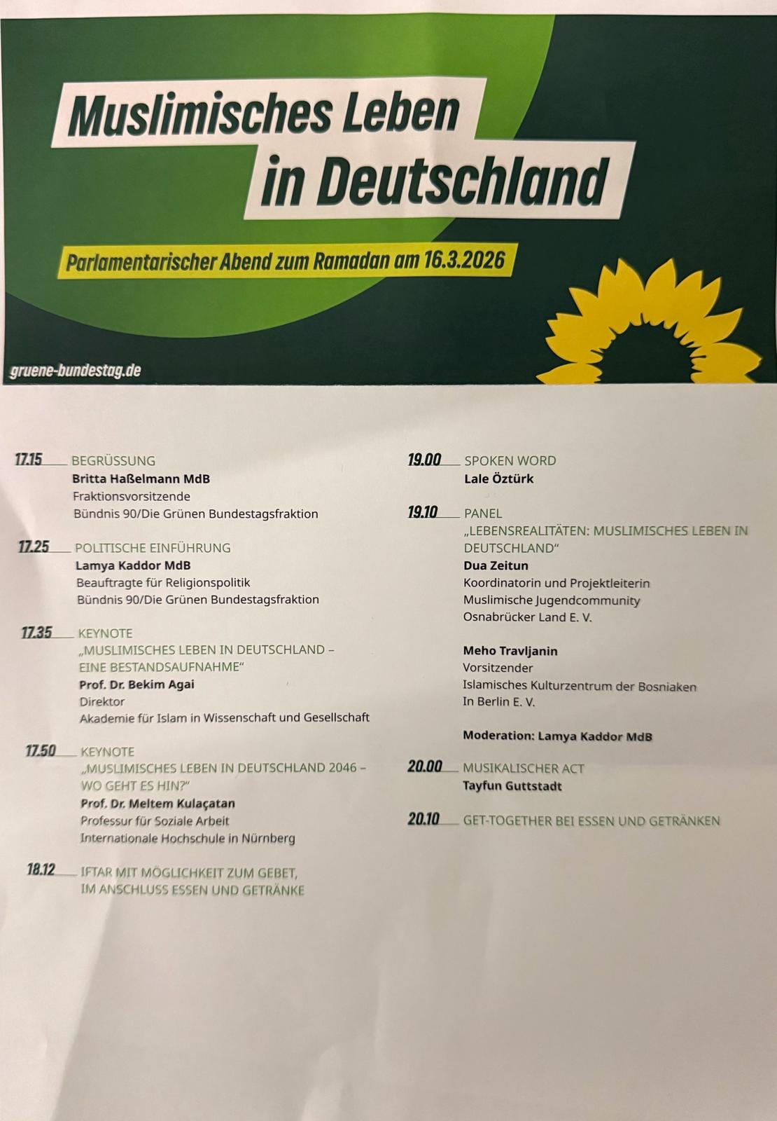 U zgradi njemačkog Bundestaga 16. marta 2026. godine održan je prvi zvanični iftar pod nazivom „Život muslimana u Njemačkoj – Parlamentarno veče u ramazanu“. Događaj je organizovan na inicijativu stranke Zelenih i njihove poslaničke grupe, čime je otvoreno novo poglavlje u institucionalnom prepoznavanju vjerske i kulturne raznolikosti Njemačke.